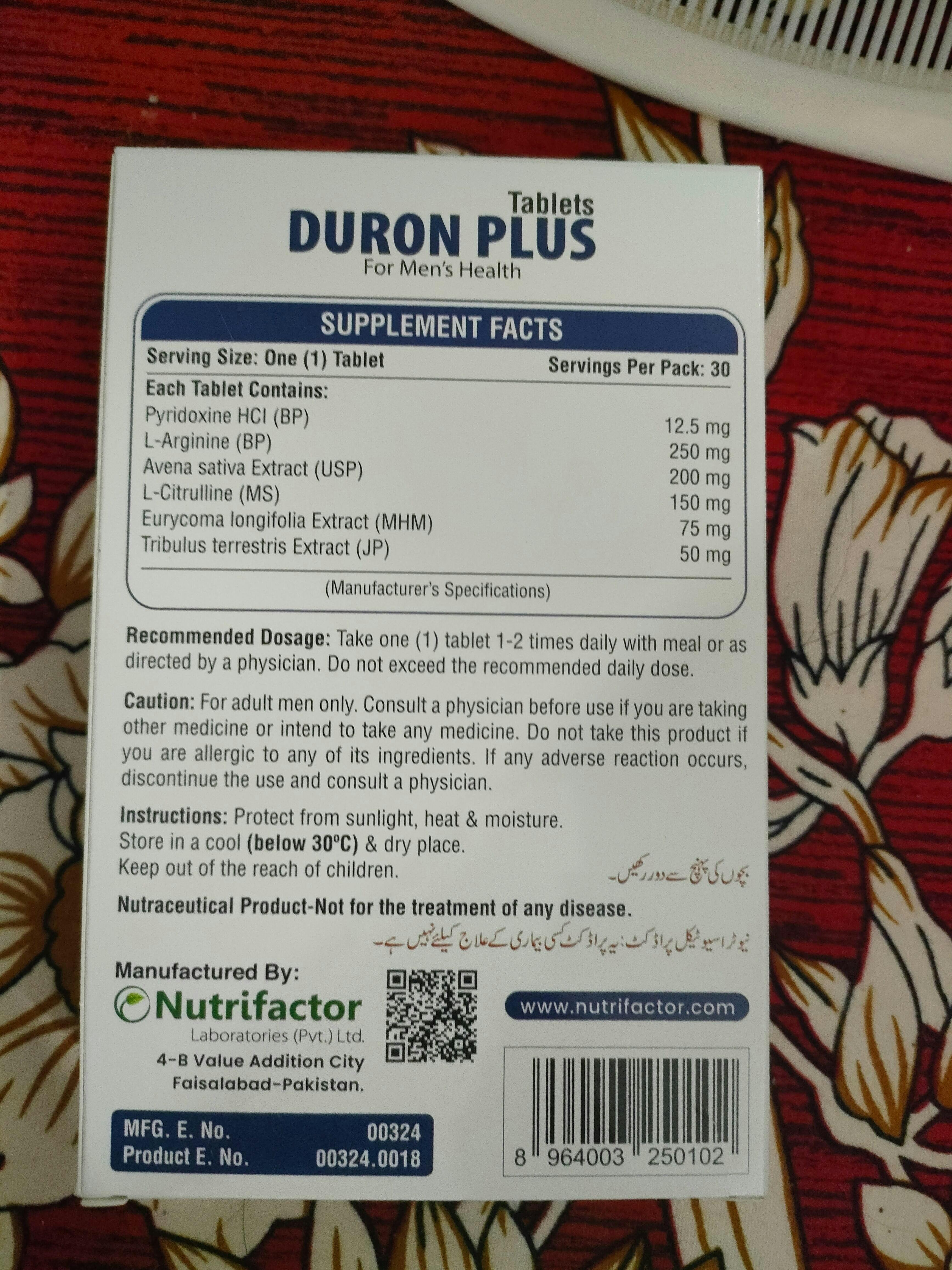 ۔Nutrifactor's Duron Plus میں جڑی بوٹیوں کے عرق شامل ہیں جو ایکٹو اور اتھلیٹک مردوں کی صحت اور توانائی کے لیے مدد فراہم کرنے میں مدد کرتے ہیں۔ یہ روایتی طور پر استعمال ہونے والے کثیر غذائی اجزاء کا ایک سپیکٹرم ہے جو مردوں میں طاقت اور تولیدی صحت کو سہارا دیتا ہے۔